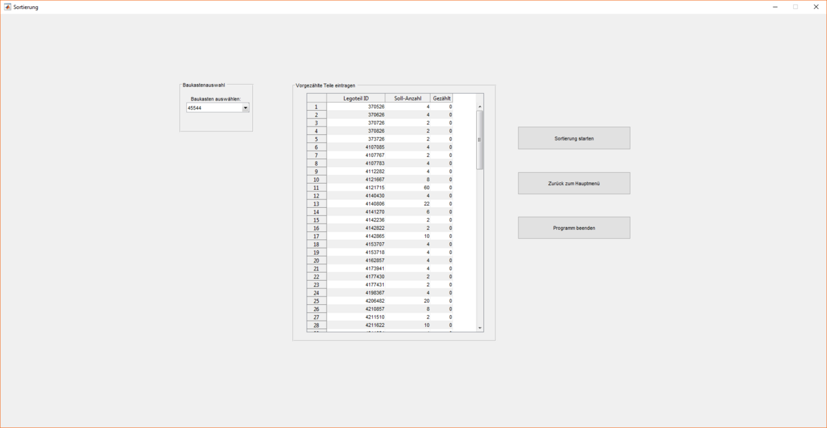 Nach dem Starten des Programmes erscheint das Hauptfenster (vgl. Abbildung 7), in dem zwischen Sortierung, Anlernen und Baukasten bearbeiten gewählt werden kann.