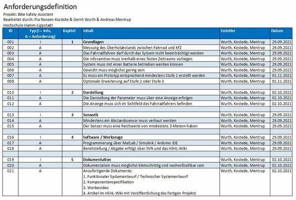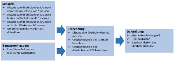 Daher ist es notwendig, sich als Fahrradfahrer zusätzlich selbst zu schützen. Hierbei hilft der Bike Safety Assistent, ein Abstandsmesssystem für das Fahrrad. Dieser misst den zu erwartenden Seitenabstand und zeigt diesen dem Fahrradfahrer an. Der Bike Safety Assistent soll im Rahmen dieses Projektes im Fach Angewandte Elektrotechnik im Masterstudiengang Business and Systems Engineering entwickelt und realisiert werden.