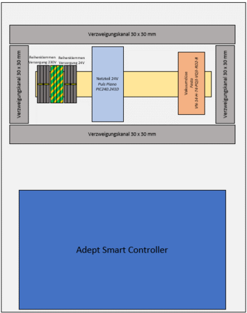 Als erstes wurde der Adept Smart Controller als Mittelpunkt des Systems definiert. Alle Komponenten, welche mit diesem kommunizieren, wurden graphisch mit diesem verbunden. Auch eine Kommunikation der verschiedenen Komponenten untereinander wurde dargestellt.