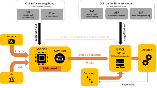 Die OSE Softwareumgebung beinhaltet die Bild- und Objekterkennung mit Laserscanner die Lidar-Verarbeitung, sowie die Implementierung der RS232 Kommunikation.