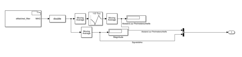 Aufgrund der erhaltenen gefilterten Werte des Matched-Filters aus der Simulink Library ist eine eindeutige Zuordnung des Standortes in Bezug auf die Perimeterschleife nicht gewährleistet. Eine eindeutige Zuweisung eines Wertes zum Zustand kann nicht getroffen werden. Außerdem kann anhand dieses Filters ebenfalls nicht der Abstand des Roboters zur Perimeterschleife detektiert werden. Als Lösung für dieses Problem wird eine eigenständige S-Function mit dem vorhandenen Arduino C-Code umgesetzt. Diese Lösung wird im nächsten Kapitel erläutert.