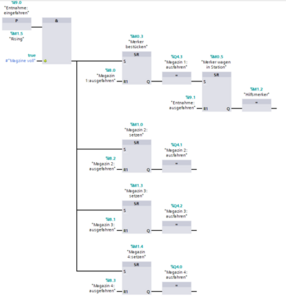 Im funktionalen Systementwurf wird die Fertigungsaufgabe in kleine Teilaufgaben runtergebrochen. Für die vorliegen Station teilt sich die Aufgabe in das Entnehmen des Warenträgers (WTs) vom Förderband, das Positionieren der Einzelteile und das anschließende Rückführen und weitergeben des WTs. Das Positionieren kann hierbei weiter unterteilt werden in das Speichern vereinzeln und genaue Positionieren auf dem WT.