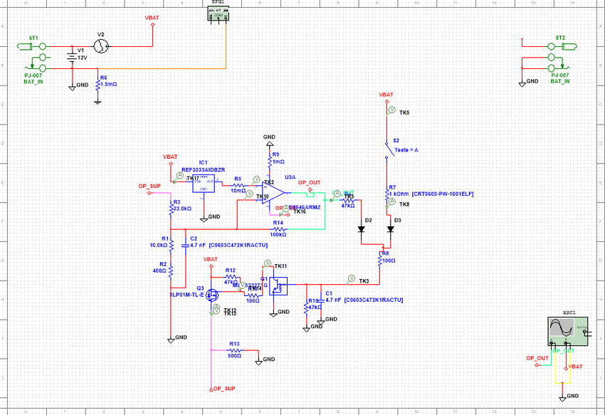 Damit der Operationsverstärker stets eine gesicherte Referenz sieht und somit kein undefinierter Zustand eintritt, wenn sich der Operationsverstärker über die Q3-Stufe das Licht ausknippst, muss die Referenz ständig an VBat hängen, d.h. das Bauteil ist die Key-Komponente zum Erreichen der 5µ-Anforderung.