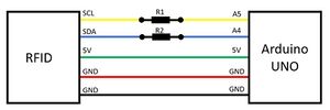 Für die Inbetriebnahme des NXT RFID Sensor wurde eine Arduino Uno verwendet. Der NXT RFID Sensor wird mit einem sechs poligen Leiter mit einer Art RJ12 [6]-Stecker mit einem Lego Mindstorm verbunden. Das Kabel wurde für den Arduino Uno aufgeschnitten und mit ihm verbunden. In der Abbildung rechts ist die Verbindung vom NXT RFID Sensorzum Arduino Uno dargestellt. Zusätzlich haben die SCL und SDA Leitungen einen 100 kΩ Pull-up Widerstand (R1 & R2). Diese sorgen dafür, dass die Signale eine definierte „0“, also einen Low-Pegel, haben. Anschließend wird der Arduino Uno über ein USB-Kabel an den PC angeschlossen.