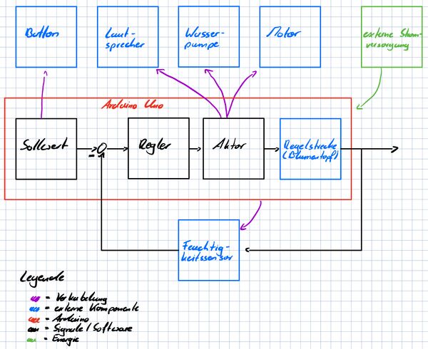 Während bisherige Projekte wie beispielsweise Smarter_Kräutergarten sich auf die Versorgung von kleinen Kräuterpflanzen fokussiert haben, ist dieses Projekt auf größere Zimmerpflanzen ausgerichtet. Die Projekte sind zwar vergleichbar, die Anforderungen für diese Art von Pflanze jedoch grundsätzlich verschieden. Da Zimmerpflanzen in deutlich größeren Töpfen wachsen, kann sich bei zu häufigem Gießen Wasser anstauen, was zu einem Verschimmeln der Wurzeln führen kann. Deswegen muss die Feuchtigkeit an verschiedenen Stellen des Topfs gemessen werden und zusätzlich zur Versorgung mit Wasser muss das Ablassen von stehendem Wasser möglich sein. Somit wird ein Regler benötigt, der die Feuchtigkeit im Topf auf einem möglichst konstanten Level hält. Die Zimmerpflanzen haben außerdem einen deutlich höheren Wasserbedarf, sodass ein großer Wassertank notwendig ist.