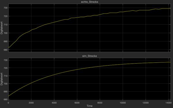 In der Reaktion ist eindeutig zu erkennen, wie sich das vom Sensor wahrgenommene Digitalwort über die Zeit erhöht. Dabei wird auch klar, dass es sich bei dem gemessenen System um ein "PT1"-System handelt. Dies wird besonders durch den starken Anstieg zu Beginn und das Abflachen nach oben hin deutlich. Dies gilt als charakteristisches Verhalten für ein "PT1"-System. Nun gilt es, dieses System mithilfe einer Übertragungsfunktion zu beschreiben, um ein simulieren des Systems zu ermöglichen.
