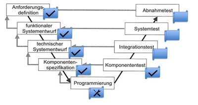 - Weiterverfolgung des V-Modells: Nach Vervollständigung der Programmierung kann dann mit dem Intrgrations-, Systems- und Abnahmetest fortgefahren werden