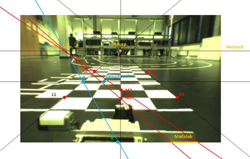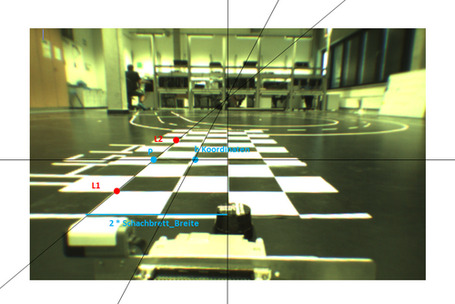 Zu erst werden die Punkte der linken Geraden und der rechten Geraden gesetzt. Um die Abstände und zugehörigen Weltkoordinaten bestimmen zu können, wurde das Fahrzeug vor einem Schachbrettmuster positioniert.