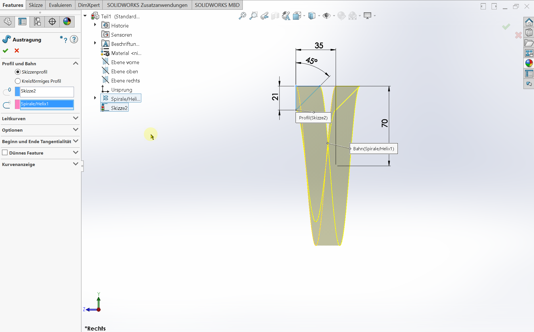 Als Rotationsform kann nun die Skizze ausgewählt und als Orientierungskurve die zuvor erstellte Helix gewählt werden.