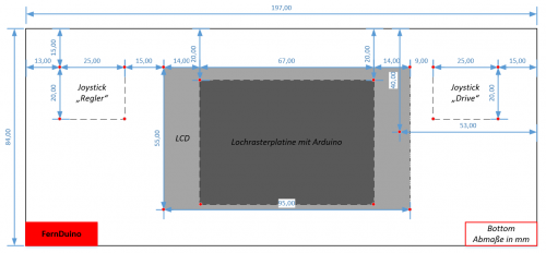 - Arduino nur zur Kannte bemaßt, mittig aufgesetzt und angezeichnet