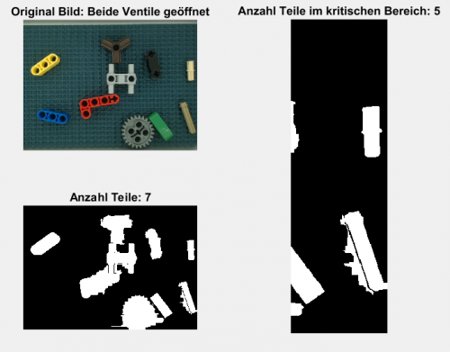Ein weiteres Problem der Separierung ist in der Ansteuerung der Druckluftdüsen zu finden. Werden mehrere Teile in dem kritischen Bereich erkannt, werden automatisch beide Düsen angesteuert und somit alle Teile an den Anfang der Teileerkennung befördert. Dadurch kann es zu einer enormen Verzögerung in der Vereinzelung der Teile kommen.