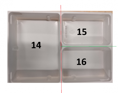 Soll das Teil in die weiße Einlage einsortiert werden, so stellt sich die rechte Klappe, bei der roten Einlage die Linke.