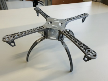 Für die Realisierungsphase wird das Drohnengerüst benötigt. Dafür wird die Drohne in der CAD-Konstruktion in ihre Einzelkomponenten zerlegt, was die Hilfsstrukturen im Druckverfahren reduziert. Das sorgt zusätzlich zur Kürzung der Fertigungszeit. Sind die Einzelteile fertig, so werden die Komponenten von der Hilfstruktur befreit und geschliffen. Im letzten Schritt werden die Komponenten zu einer Drohne zusammengeschraubt (siehe Abb. ?).