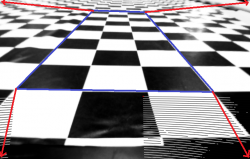 In der Abbildung ist gut zu erkennen, dass besonders das Bild im hinteren Bereich sehr gestreckt werden würde, deshalb interpoliert OpenCV an dieser Stelle, da das Ausgangs und Eingangsbild die selbe Größe haben. Ein weiterer Nachteil dieser Funktion ist, dass der Bereich außerhalb des blauen Rechtecks verloren geht und für weitere Bearbeitung in der Draufsicht nicht mehr genutzt werden kann. | |||