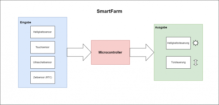 Das Projekt verfolgt das Ziel, die Tierhaltung für den Tierhalter im Einklang mit den Tieren zu erleichtern und zu optimieren. Mit Hilfe von Sensorsysteme und Aktuatoren wird dieses Ziel erreicht. Das Projekt SmartFarm bietet viele Erweiterungsmöglichkeiten für die Landwirtschaft, die im Ausblick erläutert werden. In dieser Veranstaltung liegt der Fokus auf der Tür des Hühnerstall und einer Helligkeitssteuerung. Zudem kann die Tür und die Lampe im Stall manuell angesteuert werden.