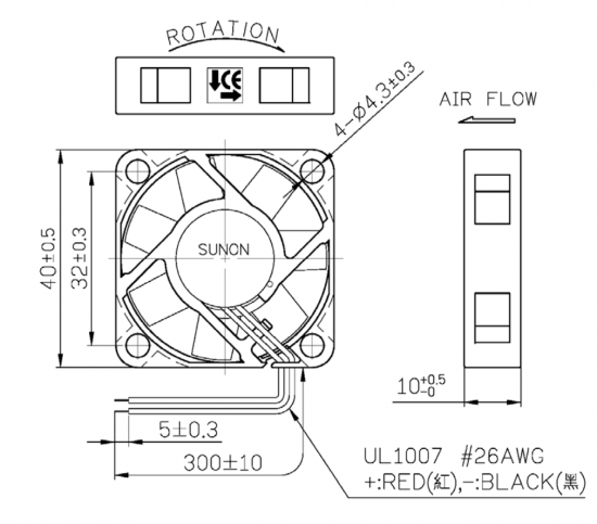 - Abmessungen des Lüfters, Befestigung an allen vier Bohrungen
