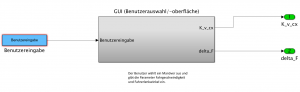 Der Eingang für dieses Modul ist die Benutzereingabe, die über die GUI umgesetzt wird. Als Ausgänge sind Fahrzeuglängsgeschwindigkeit und Fahrerlenkwinkel definiert.