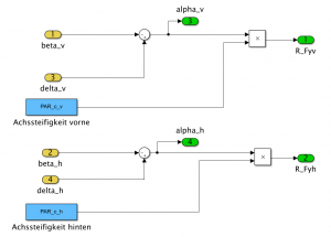 Das nachfolgende Modul "Modell" (vgl. Abb. 3) berechnet aus den Eingaben und und den voreingestellten Parametern das Fahrverhalten nach dem linearen Einspurmodell. Es setzt sich aus folgenden Komponenten zusammen: