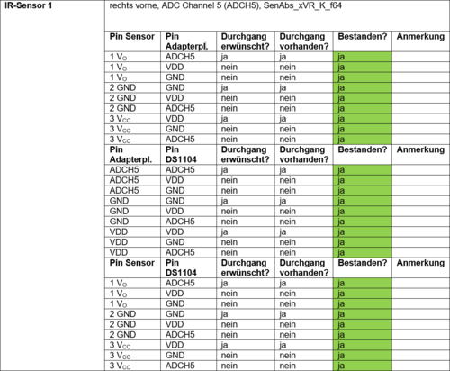 Die gesamte Vorgehensweise zur Überprüfung der Infarotsensoren ist fortführend in dem Artikel Infrarotsensoren hinterlegt. Der erste Schritt der gesamten Analyse bestand aus der Prüfung der elektrischen Verbindung zwischen den vier Infrarotsensoren, der Adapterplatine und der DS1104, dazu wurde mittels einer Durchgangsprüfung zwischen den Komponenten die Verbindungen verifiziert. Es wurden alle Tests bestanden, es sind keine Fehler in den elektrischen Verbindungen der Sensoren, das Testprotokoll ist in SVN hinterlegt.