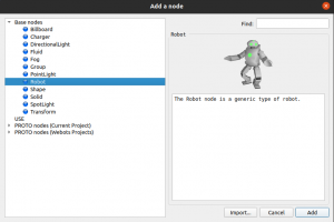 In Webots, these different types of distance sensors can be found inside DistanceSensor Node which is under the Children node of the Robot base node. There is an example in Figure. 8 that shows how to change between different types of Distance Sensors by selecting the 'type' field of DistanceSensor from the scene tree. Later when we use Ultrasonic Sensor for avoiding obstacles, we change the type of the DistanceSensor to Sonar.