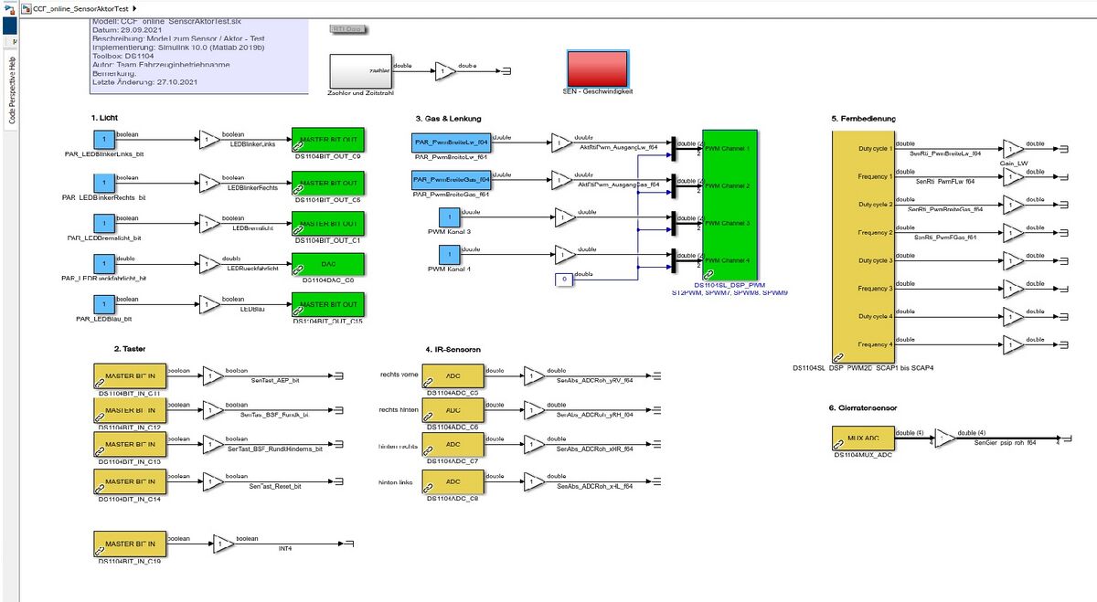 Das Online-Modell dient zur Laufzeit des Fahrzeugs. Aus diesem Datenfluss ist zu ersehen, dass in dem Sensoren Block die Signale vom Kamera, Längsgeschwindigkeit, Gierrate, Fernbediengung, Abstandsensorik und Taster geleitet werden, und die Sensoren an die DSpace-Karte liefern in das Programm eingelesen. In dem Block Signalaufbereitung werden die Signal des Gyro-Sensors bearbeitet und Informationen fusioniert und die Spurkoeffizienten gefiltert, damit das Fahrzeug die richtige Entscheidung trifft. Bei der Bewegungsmanagement geht es um 4 Modus. Die Längsregelung des Fahrzeugs erfordert eine exakte Bestimmung der Sollgeschwindigkeit . Die Querregelung wird verglichen, welche Bahn das Auto fahren würde (Istgröße) und welche Bahn das Auto fahren soll (Sollgröße). Beim autonomen Einparken werden eine passende Parklücke finden ,vermessen und anschließend anhalten oder einparken. Das Fahrtmodus legt fest aus welcher Quelle das Fahrzeug die aktuelle Sollgeschwindigkeit und den Solllenkwinkel wählt. Es gibt drei Möglichkeiten: Es kann unabhängig von einander die Geschwindigkeit und der Lenkwinkel des BSF und des AEP Moduls genutzt werden oder die Sollwerte können manuell festgeleget werden. In dem Aktoren-Block werden die PWM-Signale für den Lenkwinkel und die Geschwindigkeit an die RTI-Blöcke weitergeleitet werden. Zusätzlich wird das Signal für die blaue LED, die den Eingriff und die Fahrt im RC-Modus signalisiert, auf den entsprechenden Anschluss an der DSpace Karte übertragen. Zähler und Zeitstrahl sind Timer. Im Block Geschwindigkeit gibt es Hallsensoren, die zurückgelegt Strecke zu ermitteln. Die beiden Blöcke ist unabhängig voneinander und werden nicht verbinden.