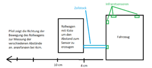 Für die Darstellung der Messkette, werden Messobjekte auf verschieden Entfernungen zum Sensor gemessen. Dazu wurde ein Messobjekt auf einem Rollwagen montiert, welches passend zur Entfernung bewegt werden konnte. Die Messung erfolgte somit kontinuierlich, von der geringsten Entfernung bis zur maximalen messbaren und logischen Entfernung (siehe Artikel des Primärsensors) des Infrarotsensors. Alle weiteren Informationen zur Messung befinden sich in der Tabelle 6 Messdatenbeschreibung.