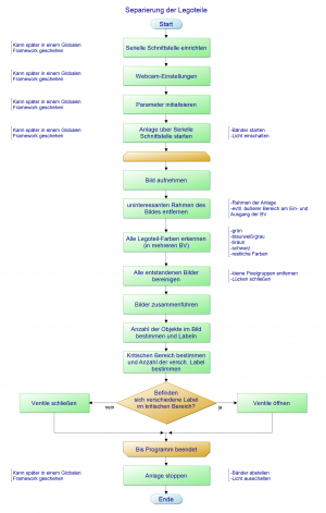 Zur Umsetzung der Separierung wurde eine Funktion entwickelt, die Gruppen von Legoteilen erkennen soll und die Separierung per Luftdruck durchführt (siehe Abbildun X). Zu Beginn der Separierungsfunktion müssen zunächst Steuerbefehle zur Betreibung der Anlage erteilt werden. Dazu gehört die Einrichtung einer Seriellen Schnittstelle mit dem steuernden Arduino. Außerdem sind Einstellungen an der Webcam vorzunehmen, um Fehler durch unterschiedliche Kameraparameter zu verhindern. Diese können beispielsweise durch Kalibrierungsfunktionen entstehen. Neben der Definition von weiteren Parametern, mit denen sich beispielsweise der betrachtete Bereich im inneren der Bildverarbeitungsbox einstellen lässt, wird die Anlage automatisch gestartet, d.h. es sind die Laufbänder zu starten und das Licht in der Fotobox einzuschalten. Nach dem die Anlage gestartet wurde, wird die eigentliche Funktion der Legoteil-Gruppenerkennung gestartet. Es wird ein Bild vom Innenraum der Bildverarbeitung aufgenommen (siehe Abbildung X, oben links) und anhand der zuvor eingestellten Parameter so zugeschnitten, dass Bildränder und weitere uninteressante Bereiche wie der unmittelbare Ein- und Ausgangsbereich entfernt werden. Anschließend wird das Bild so gefiltert, dass nur noch die Legofarben Inhalt des Bildes sind. Das Ergebnis wird dabei in ein Binärbildumgewandelt, die Erkennung der Farben wird durch mehrere Unterfunktionen realisisert. Die entstandenen Bilder werden von kleinen Pixelelementen entfernt, und Lücken im Inneren der Objekte geschlossen. Anschließend werden die Bilder zu einem zusammengeführt. Durch Labeln der Pixelgruppen kann nun die Anzahl der Objekte im Raum bestimmt werden (siehe Abbildung X, unten liks). Anschließend wird ein zweiter Zuschnitt des Bildes vorgenommen, der einen kritischen Bereich betrachtet. Dieser Bereich liegt an einer Stelle, an der die Luftdruckdüsen präzise auf die Legoteile ausgerichtet sind. Außerdem handelt es sich hieberi um einen dünnen Streifen, der die Breite des Förderbandes aber zwingend abdecken muss. Nach dem erneuten Zuschnitt des Bildes wird ausgewertet, wie viele verschiedene Label in diesem Bereich vertreten sind (siehe Abbildung X, rechts). Befindet sich mehr als ein Objekt im kritischen Bereich, sind die Luftdruckdüsen anzusteuern, da die Legoteile nicht separiert in der Legoteilerkennung ankommen würden. Befindet sich ein oder kein Legoteil in diesem Bereich, werden die Düsen geschlossen und die Teile werden in die Legoteilerkennung befördert. Diese Funktion muss während des gesamten Programmablaufs durchgeführt werden. Wird das Programm beendet, wird die Anlage gestoppt, d.h. das Licht und die Motoren werden ausgeschaltet.