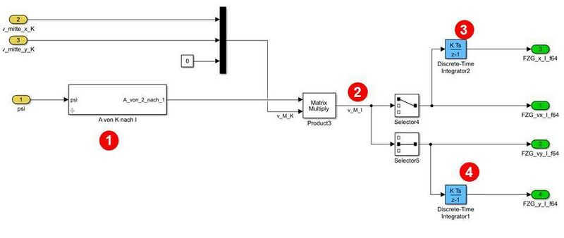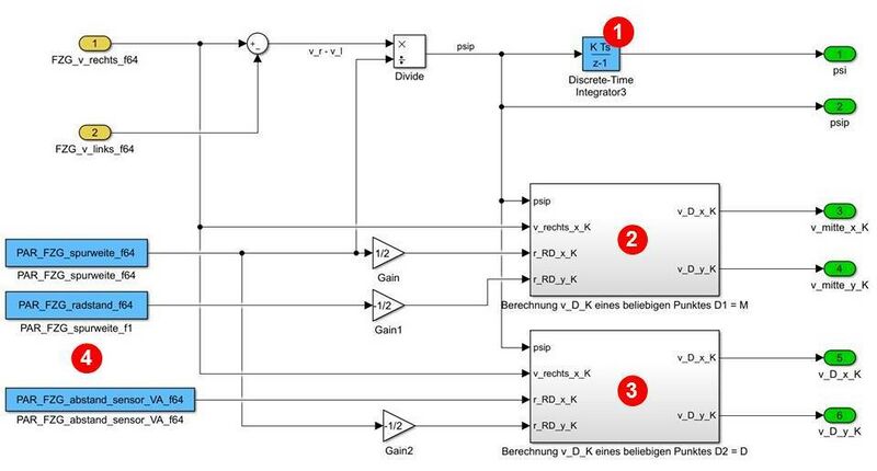 • ein Block "Gieren und Geschwindigkeit in Achsmitte", in dem die Position und Geschwindikeit der Punkte M und D in Fahrzeugkoordinaten K bestimmt werden.
