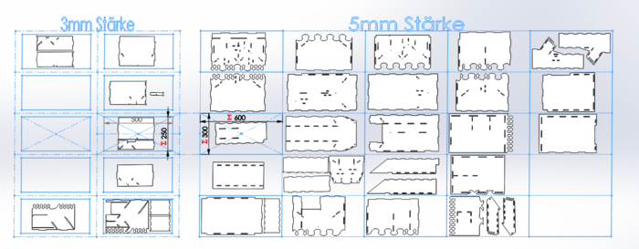 Aufgrund des beschränkten Fertigungsraumes, sowohl des 3D-Druckers als auch des Lasercutters, mussten große Bauteile teils mehrfach getrennt und in sich steckbar sowie stabil, umkonstruiert werden. Alle 37 Bauteile, die aus Acrylglas gefertigt werden sollen, wurden bereits in SolidWorks so angeordnet, dass möglichst wenig Platten zur Herstellung aller Bauteile von Nöten sind. (vgl. 'Abb. 7')