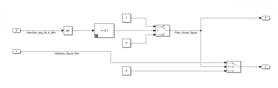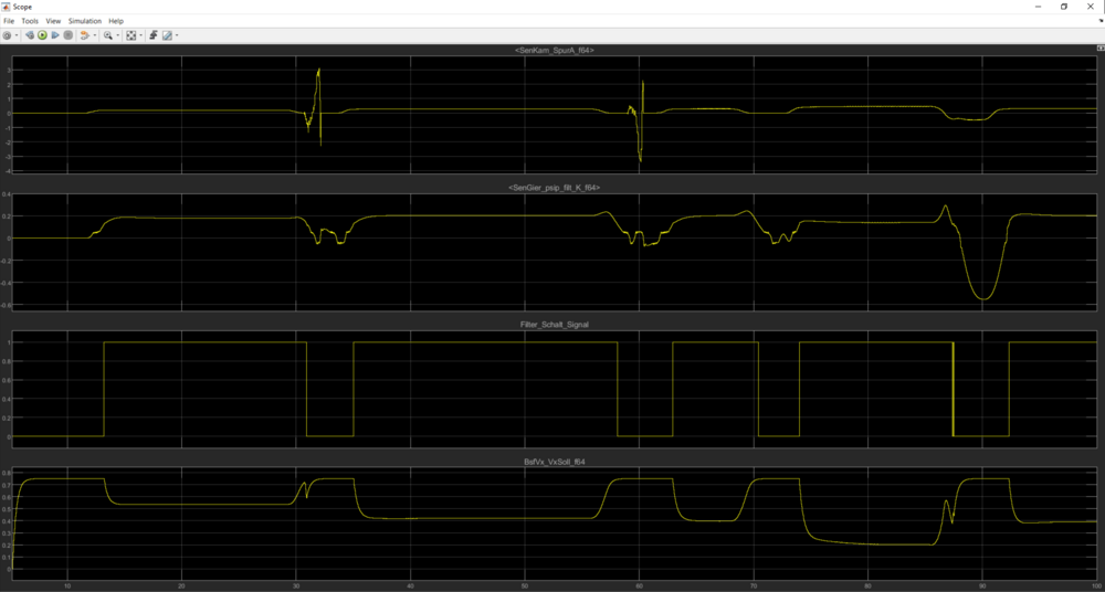 Wie in Abbildung 5 bei Signal SenKam_SpurA_f64 zusehen ist, befinden sich im Bereich 31 bis 36 und 63 bis 67 auf der x Achse (T für Zeit) Störungen, die durch die Überfahrt der Kreuzung entstehen. Durch die fehlende mittlere Fahrbahnmarkierung, kommt es zu Fehlern bei der Berechnung der Kurvenkrümmung im Modul Spurerkennung. Die Auswirkung dieser Störung sind ebenfalls im Signal BsfVx_VxSoll_unfilt_f64 zu beobachten. Letztendlich ist auch nach der Filterung mit einem Tiefpass im dritten Signal keine Verbesserung der Störung zu entnehmen.