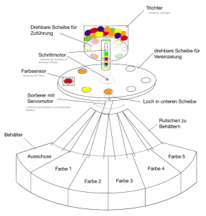 Das System besteht aus verschiedenen Komponenten. Das Schüttgut, welches sich in einem Vorratsbehälter befindet, wird vereinzelt und dann der Farberkennung übergeben. Zur Erfassung der Farbe wird ein Farbsensor des Typs TCS34725 eingesetzt. Die dadurch ermittelten Daten werden von einem Mikrocontroller verarbeitet. Anschließend wird das Gut mit einer Sortieranlage dem passenden Behälter der jeweiligen Farbe zugeführt. Der Sortiervorgang soll automatisch beendet werden, sobald ein Sensor am Vorratsbehälter meldet, dass der Behälter leer ist. Optional kann das System durch eine RGB LED, welche die gemessene Farbe anzeigt, sowie durch einen RFID-Sensor erweitert werden, der eine Freischaltung der Farbsortiermaschine nur mit einer passenden Chipkarte ermöglicht.
