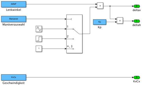 Im ersten Modul befindet sich die Manöversteuerung. Diese gibt die Geschwindigkeit und das Manöver vor. Diese beiden Ausgänge werden im nächsten Modul, dem Modell, als Eingänge genutzt.